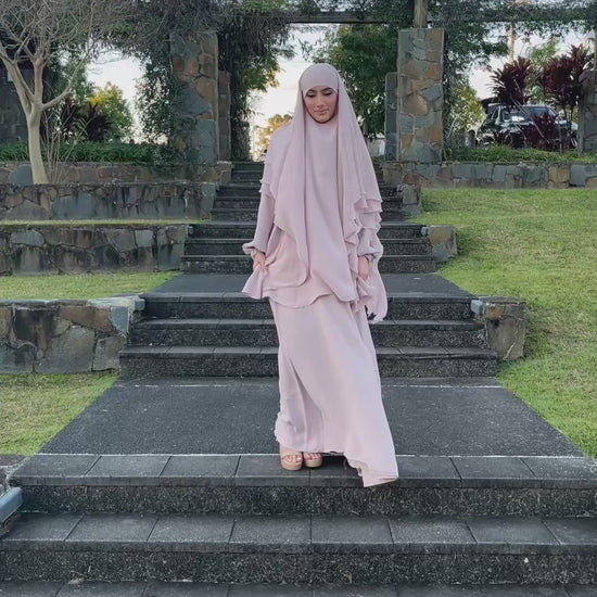 This Khimar & Abaya Set features a triple layer Indonesian chiffon khimar with a front length of 90cm and back length of 135cm. The abaya combines a chiffon layer with high-quality Nida fabric underneath, designed in a straight cut with balloon sleeves for a refined look. Each khimar includes two discreet in the strings, allowing you to easily transform it into a niqab.